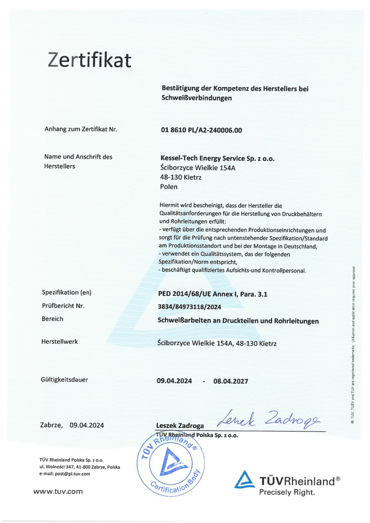 • Kwalifikacja zakładu produkcyjnego do wytwarzania urządzeń ciśnieniowych PL, DE, EN
