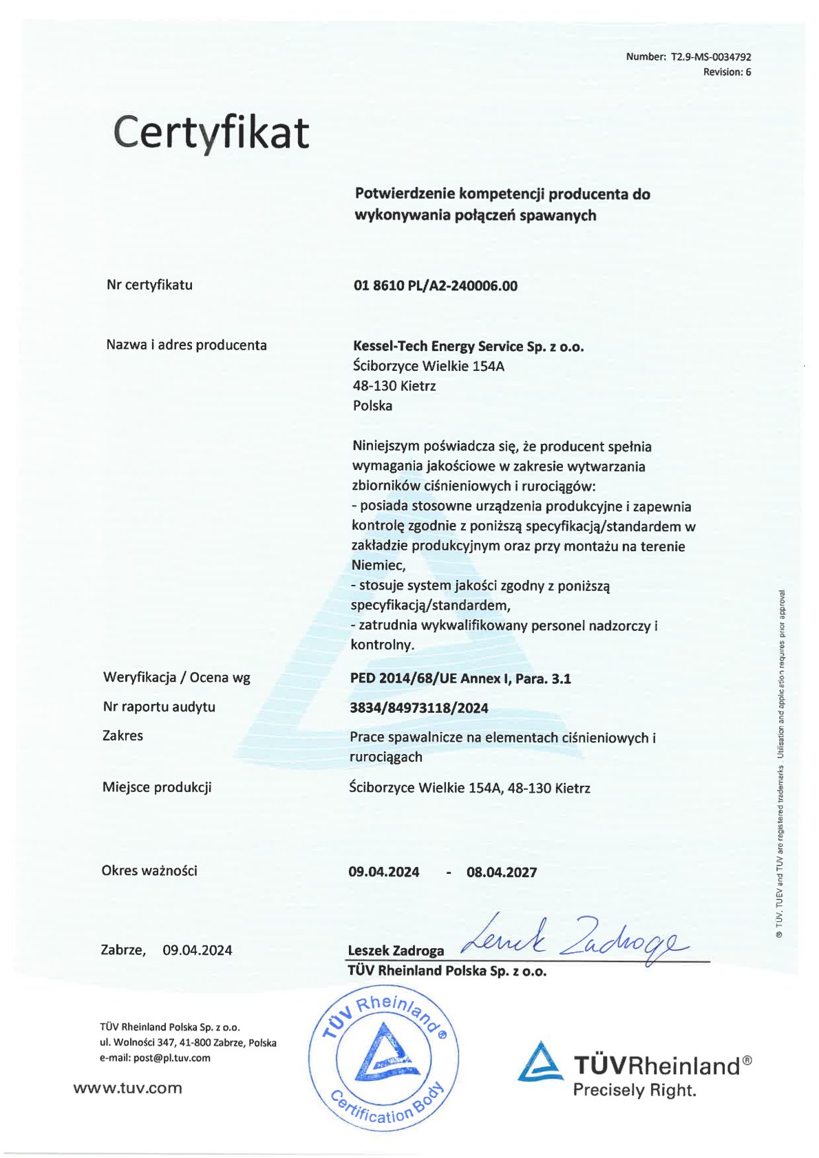 • Potwierdzenie kompetencji producenta do wykonania połączeń spawanych PL, DE