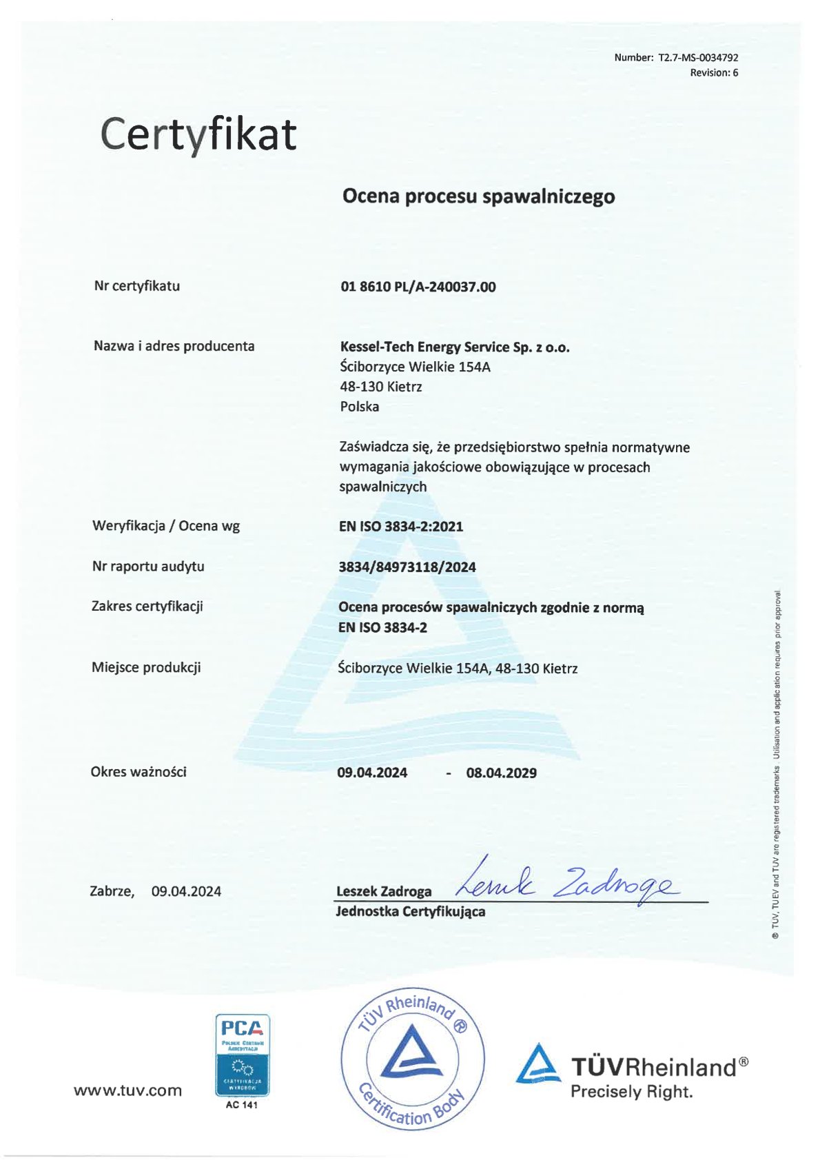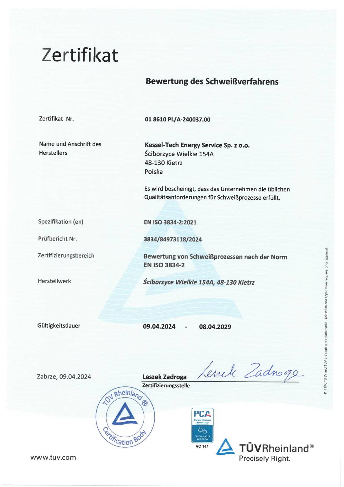 • Certyfikat systemu zarządzania jakością w spawalnictwie ISO 3834-2, AD-Merkblatt HP0, TRD 201 PL, DE