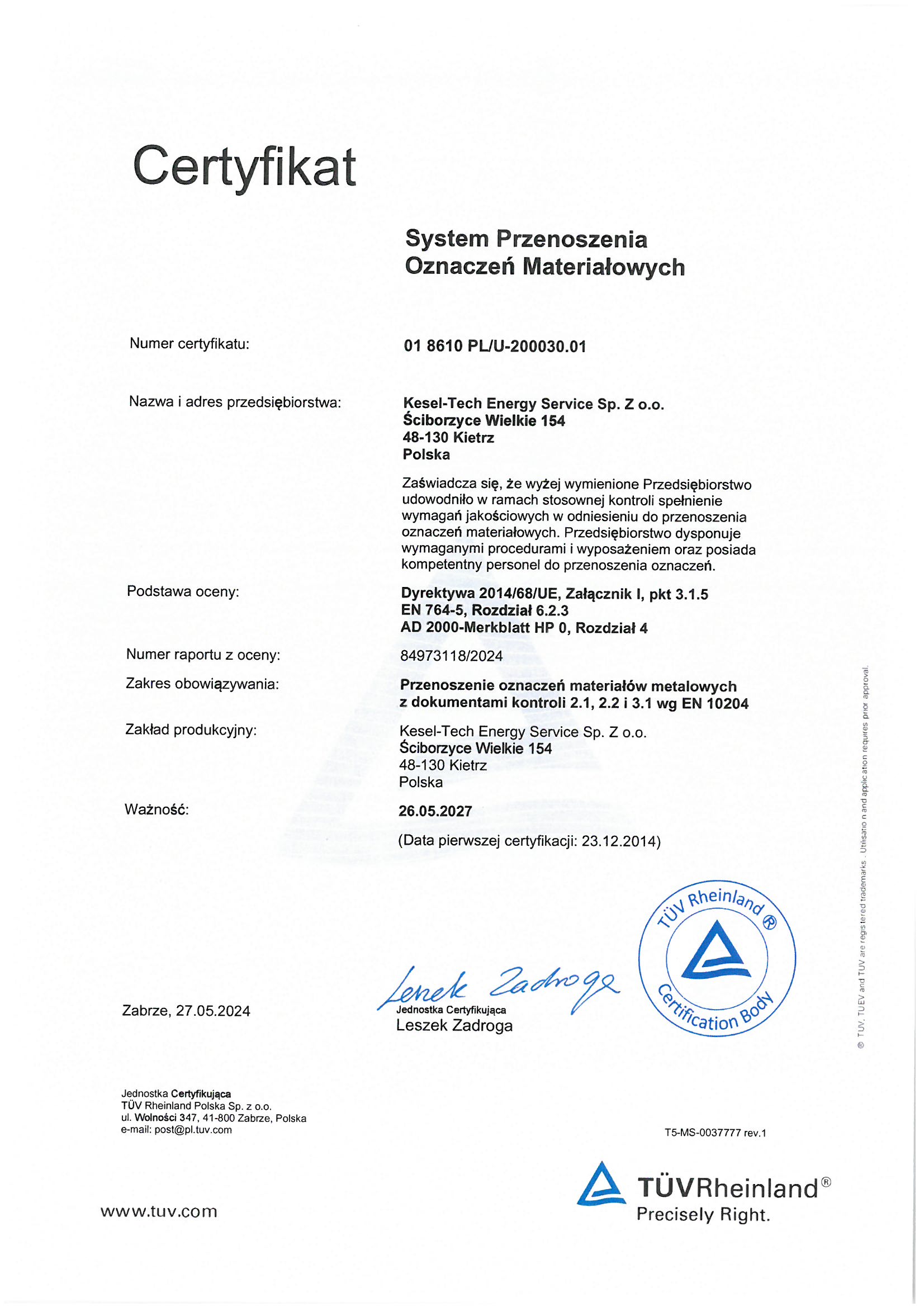 • Certyfikat przenoszenia oznaczeń materiałowych PL, DE, EN